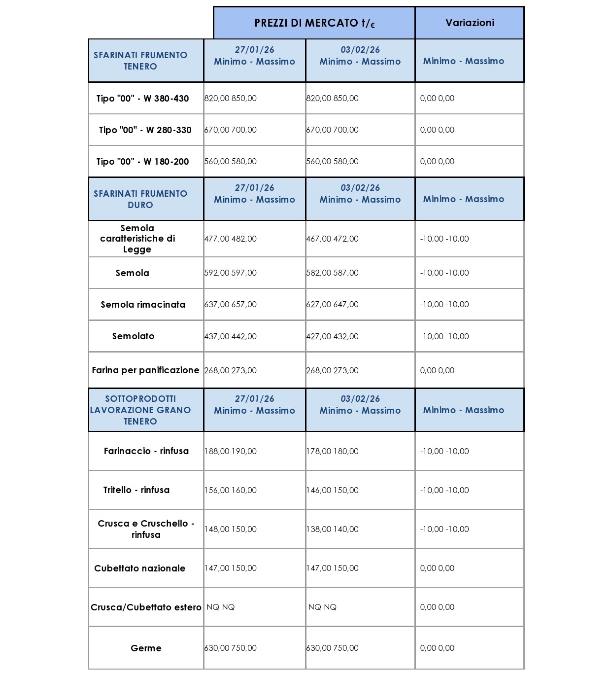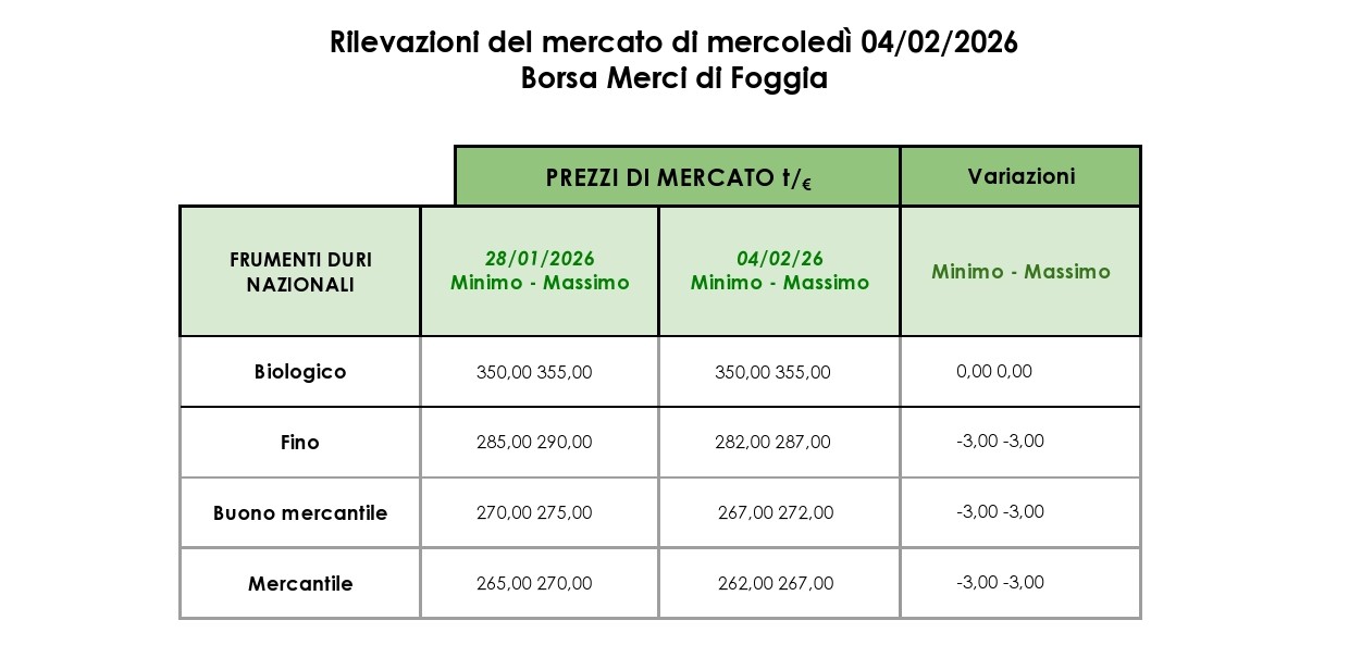 Torna la stabilità per il grano duro a Bologna, mentre si registrano cali a Foggia e Milano, entrambi di 3 €/t. Sul fronte del grano tenero, lievi ribassi diffusi caratterizzano Milano e Bologna per il prodotto nazionale, con riduzioni di 1 €/t su diverse voci. Più marcato il calo del prodotto estero a Bologna, dove la merce proveniente dal Nord America perde 5 €/t. La settimana si conferma all’insegna di aggiustamenti al ribasso, con dinamiche differenziate tra le diverse piazze e origini del prodotto.