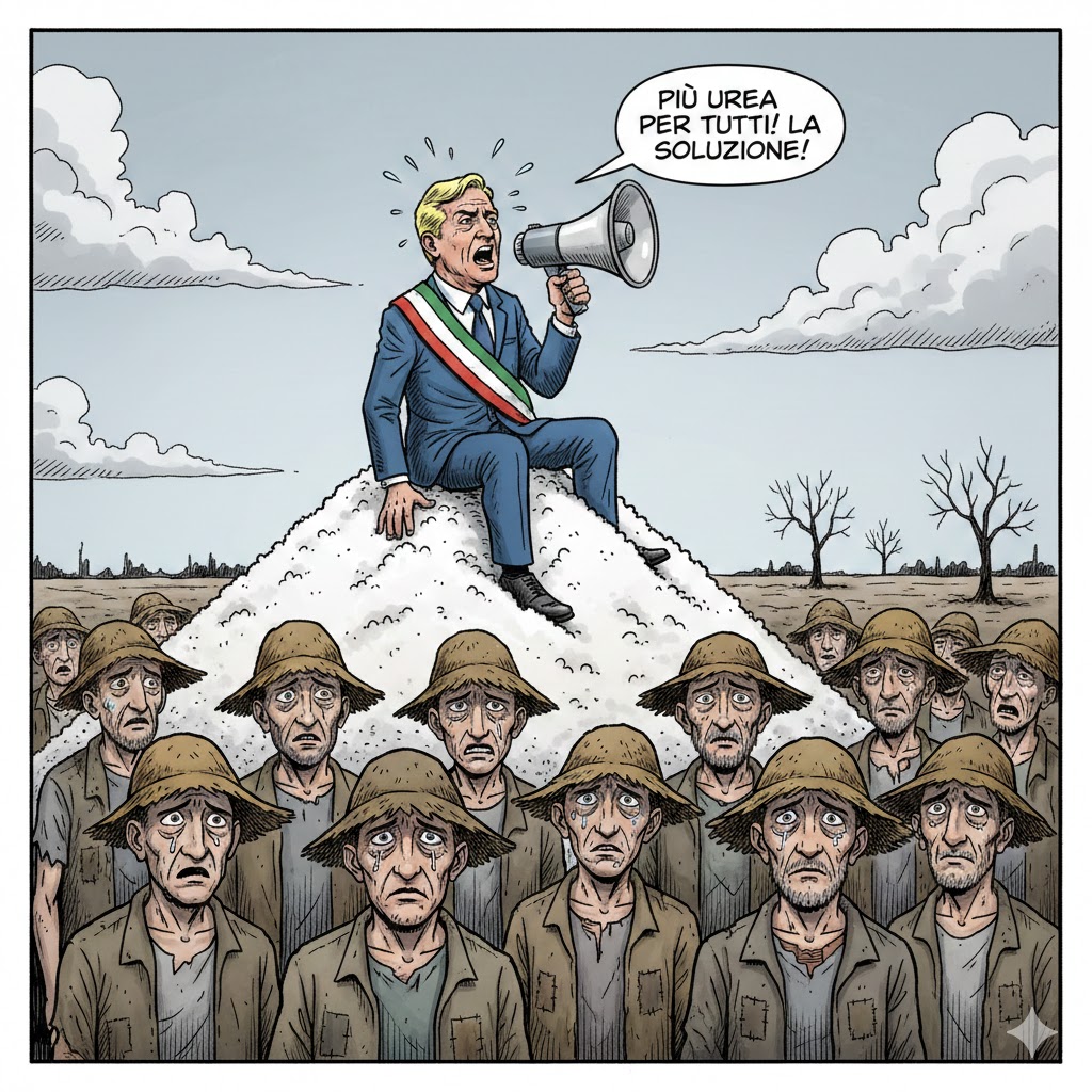 Considerando che i beni scambiati in questa categoria sono principalmente materie prime, tale differenziale tariffario ostacola gli sforzi di diversificazione delle importazioni dell’Unione. Per i fertilizzanti a base di azoto rientranti nell’ambito del presente regolamento, l’UE è un grande importatore netto strutturale a livello mondiale, con un’offerta concentrata, per quanto riguarda sia l’ammoniaca sia l’urea, in soli tre principali partner commerciali, tra cui figura la Federazione Russa in entrambi i casi». (Prosegue dopo la vignetta, creata dall’intelligenza artificiale sulla base dei contenuti dell’articolo)