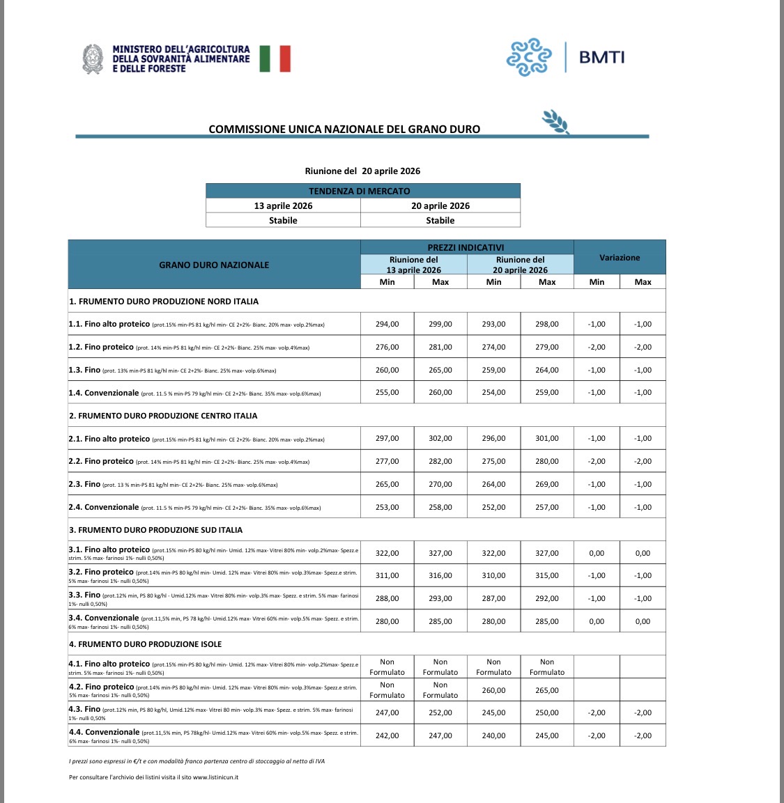 La settimana si apre con la Cun grano duro che recepisce la discesa dei prezzi dei trasporti nella scorsa settimana. Gli agricoltori si lamentano, perché la commissione nata per rilanciare il valore del durum non riesce ad avvicinarsi ai costi Ismea, come si sperava. C’è chi parla di “tante aspettative, pochi risultati”: a smarcarsi dall’entusiasmo iniziale per la commissione voluta dal ministro Lollobrigida è il presidente del Consorzio Agrario delle Marche, Alessandrini, in questo video. Per tornare al listino Cun, la raffica di segni meno (del tutto analoga a quella che registra un importante listino privato che toglie due euro a tutte le categorie di frumento duro) si può ricondurre alla volatilità del greggio – oggetto di un lieve nei giorni scorsi – e non è un bel segnale, perchè se il petrolio calasse veramente con i colloqui di pace si registrerebbe un deprezzamento ancor più sensibile del grano duro.